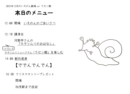 毎月第二日曜日に開催される「いそのん劇場」が、12月14日京都の南の端にあるカタツムリの博物館「ラセン館」で開催されました。