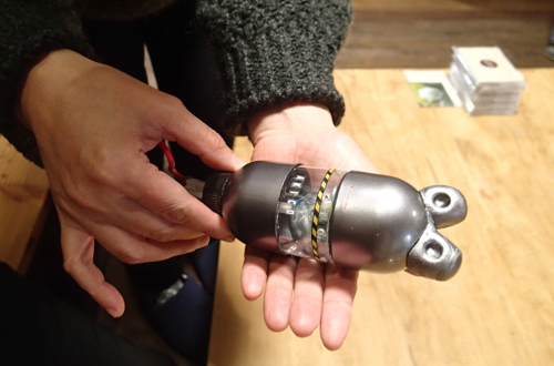 この日、大事な新作を納めたケースと、ウミノモトが取り付けられたままのAKICOをラセン館まで運んできたのはカエル星人ケロ。