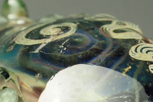 うずを巻いた細い線の模様の下に青いビロードのようなおおきなうずがあります。