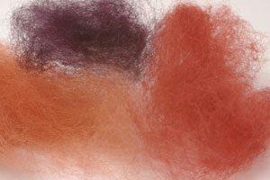 これは染めた羊毛。 もともとはフェルトを作ったり毛糸を紡いだりする為の材料です。 この羊毛で鯨モチーフのとんぼ玉をくるんで(繊維がクロスするように気をつけて!)シャンプーをヒトたらししたぬるま湯でごしごし揉みます。
