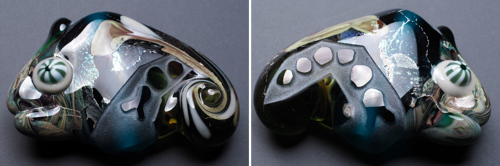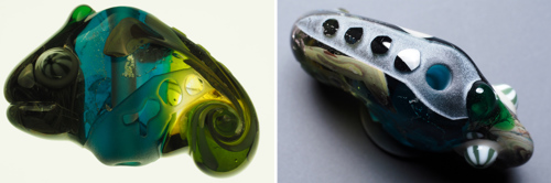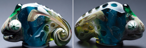 そして多色をまぜこんで混沌とした部分や銀箔の反応が作る模様、または銀箔の成分による反射、サンドブラストで削ったざらざらが、光に透かした時とそうでない時でみせる変化がとても楽しいのです。