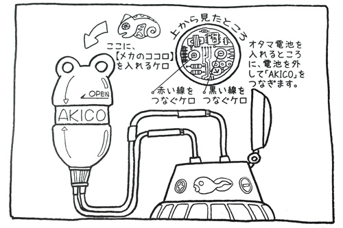 礒野昭子と面白いことをするというウェブサイト「スタヂオi」のおはなしの中に出てくる、カエル星の高度なテクノロジーによる機器「AKICO(アーティフィシャル・ケロテリジェンス・インターフェース・コア)にセットするピースとして誕生した作品です。