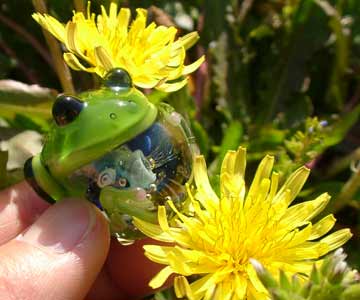 あたたかい陽射しのなかを蛙をつれてお散歩です。元気で明るいタンポポは大好きな花の一つです。