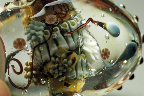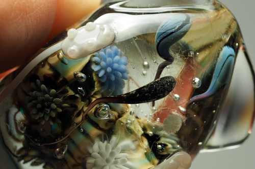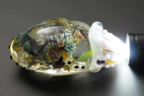 束ねた足の中に色ガラスを仕込んであるので、足先から光をいれると、全体に色がつきます。